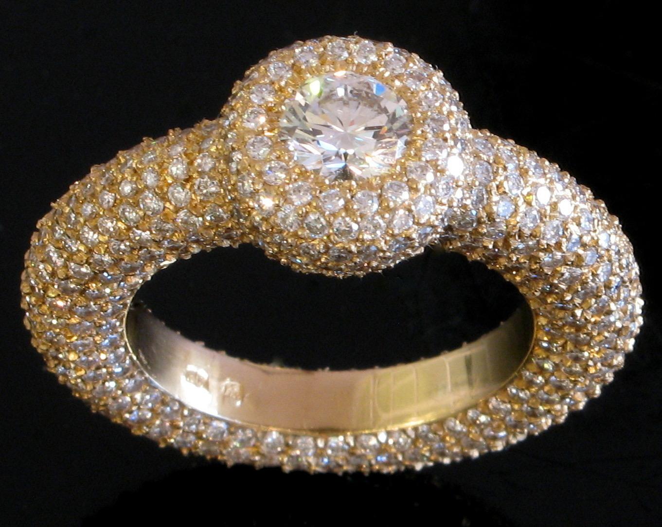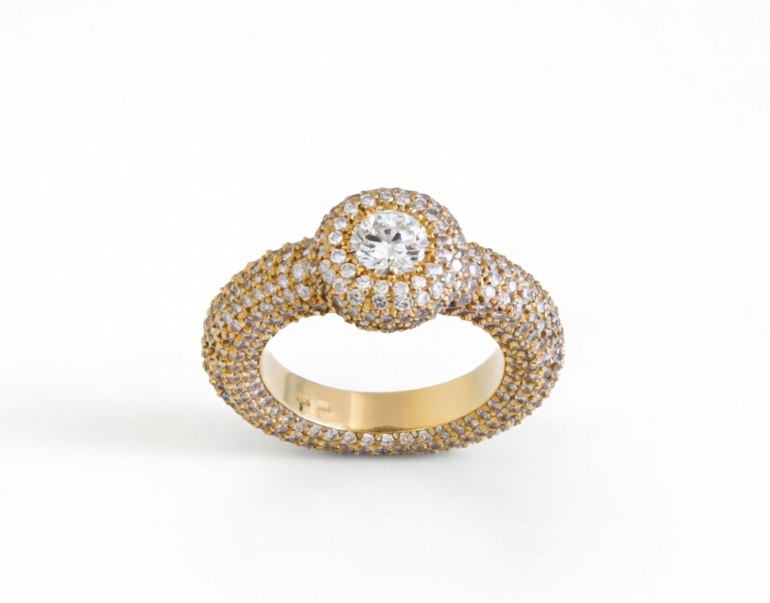 The central solitaire floats like a fallen star, crowned in golden fire, encircled by its own constellation, while the twin arcs of the band ripple outward, echoing the moon’s quiet pull on hidden tides.