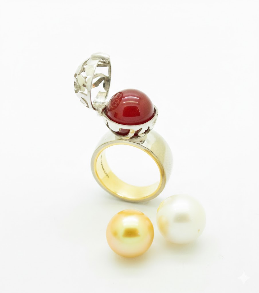 Why choose one mood when you can capture them all? This ingenious “Orb & Cage” ring is a celebration of versatility and fine engineering.